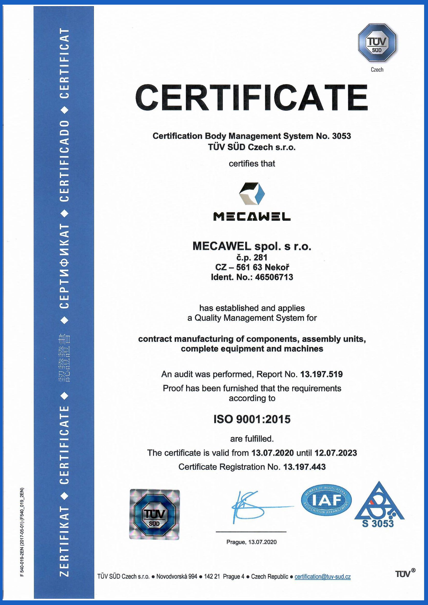 Based on the audit performed by the company TÜV SÜD Czech s.r.o. the fulfilment of requirements of the standard ČSN EN ISO 9001:2015 has been proved and to the company MECAWEL spol. s r.o. a Certificate of quality management system in the branch of custom-made manufacturing of components, assembly units, complete equipments and machines has been awarded.